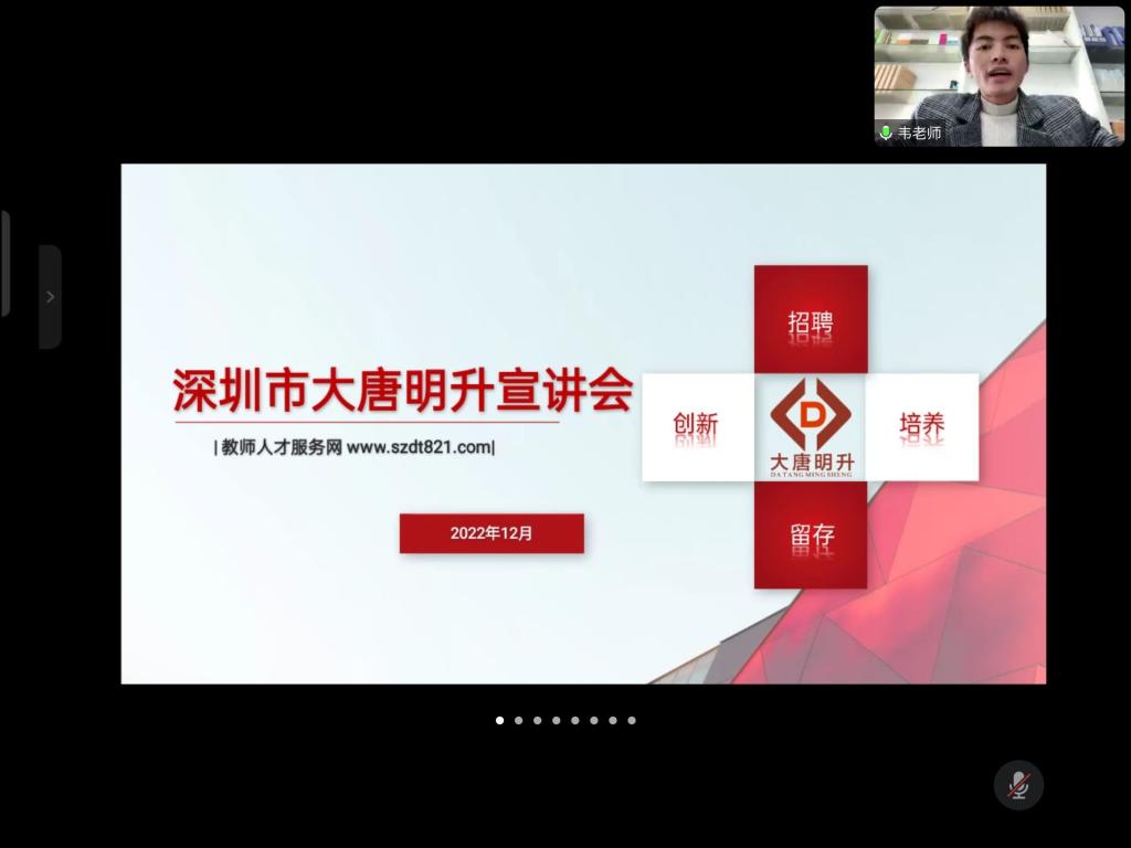 本站讯 为做好我院2023届毕业生就业服务工作,贯彻落实访企拓岗促就业专项行动,1月5日下午,我院邀请深圳市大唐明升教育集团为我院2023届毕业生举办网络专场招聘宣讲会。会议由我院就业辅导员夏恩强主持,大唐明升教育集团朱经理和相关负责人以及我院2019级毕业生参加本次会议。