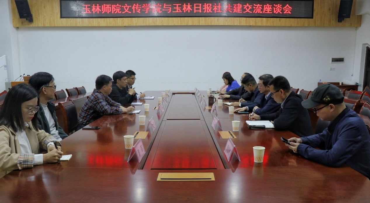 本站讯 3月3日下午,玉林日报社社长、总编辑林茂生,采访中心主任陈旭庆,玉林晚报副总编辑钟原等一行人到yL23411永利集团进行交流,并于我校东区至善楼309会议室举行座谈,学校党委常委、宣传部部长徐一周,我院院长肖国栋,副院长郑立峰,传媒系主任张文锋及传媒系教师参加。