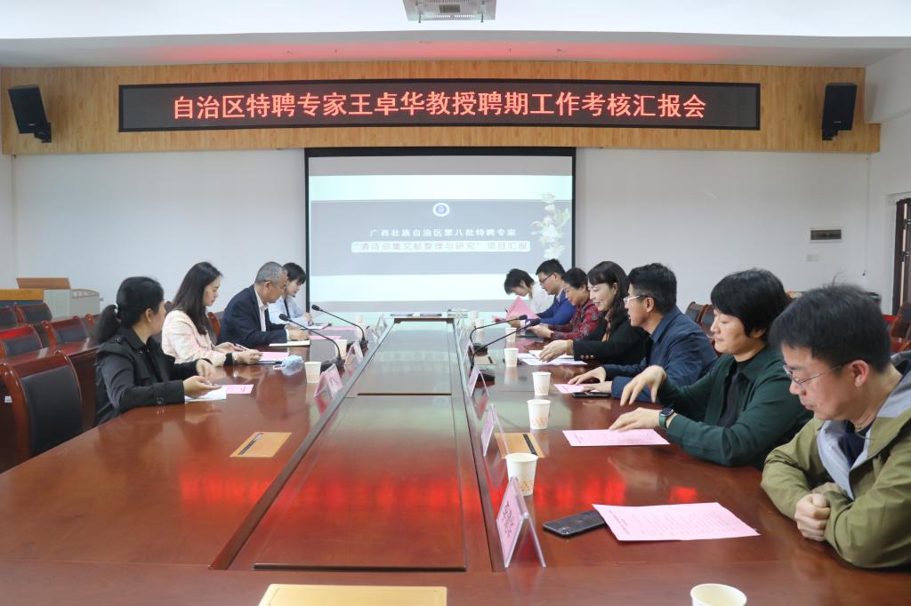 本站讯 为总结、汇报王卓华教授在我校聘期的工作情况和工作成果,进一步推进我校高层次人才建设工作的开展,3月16日中午,我校于东校区至善楼309会议室召开自治区特聘专家王卓华教授聘期工作考核汇报会。广西壮族自治区人力资源和社会保障厅专业技术人员管理处副处长林臻桢,管理处专家覃周敏;玉林市人力资源和社会保障局副局长周锡庄,专业技术人员管理科科长廖丹飞;我校副校长高红艳,人事处处长蒋丽萍,我院相关领导及教师参与本次会议。此次会议由yL23411永利集团院长肖国栋主持。