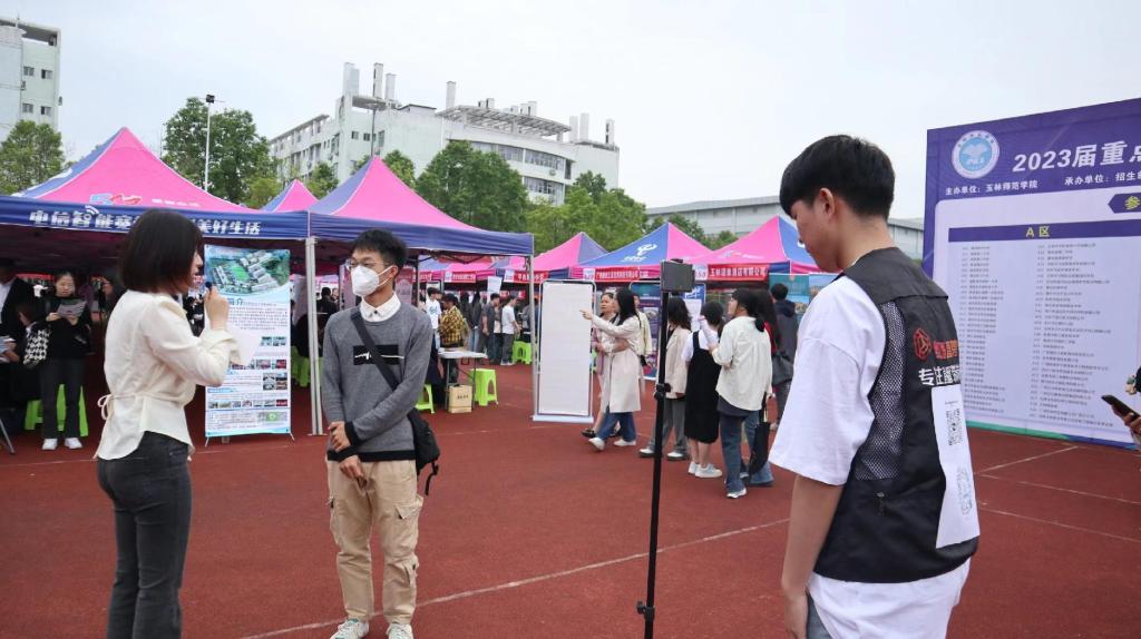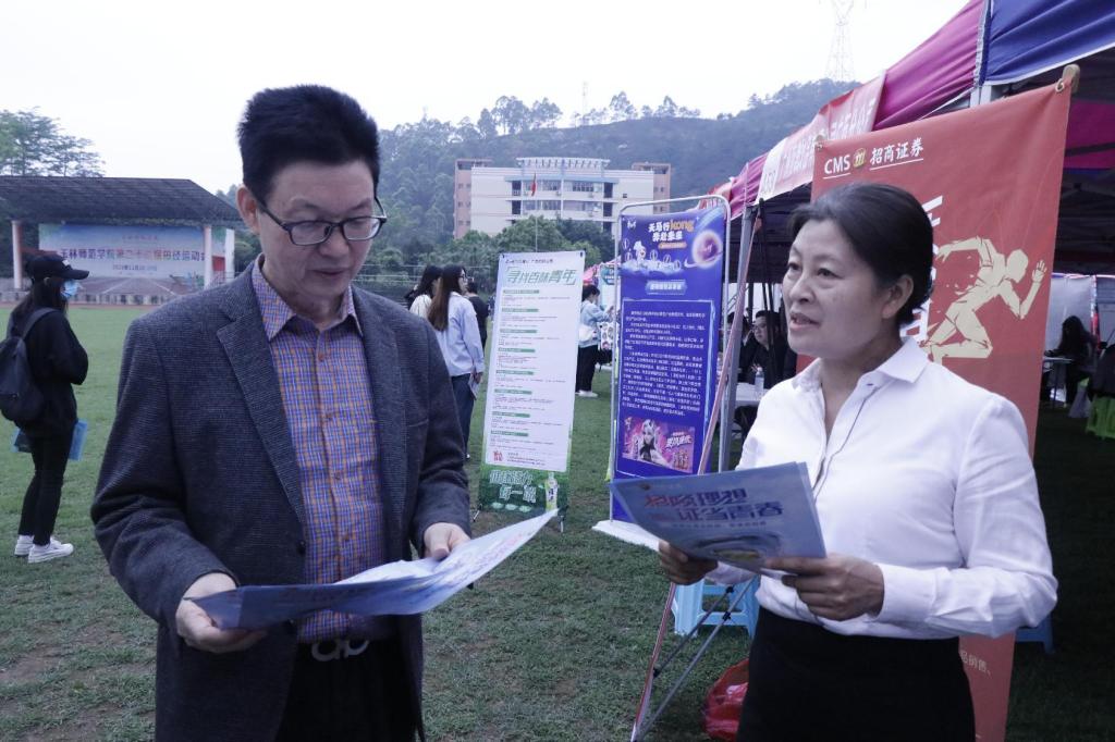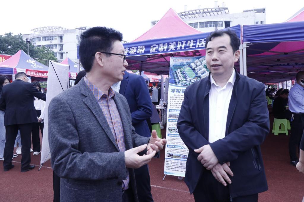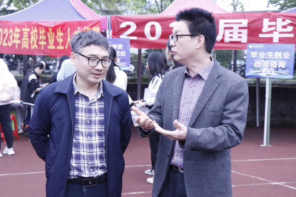 双选会期间,邱冠一行走访各用人单位,与现场招聘的用人单位深入洽谈,了解地方单位的用人需求,积极推荐我院毕业生就业。此外,邱冠还与现场求职的毕业生亲切交流,询问他们的求职意向,为他们提供就业指导建议并鼓励他们积极应聘、勇敢尝试、尽早就业。