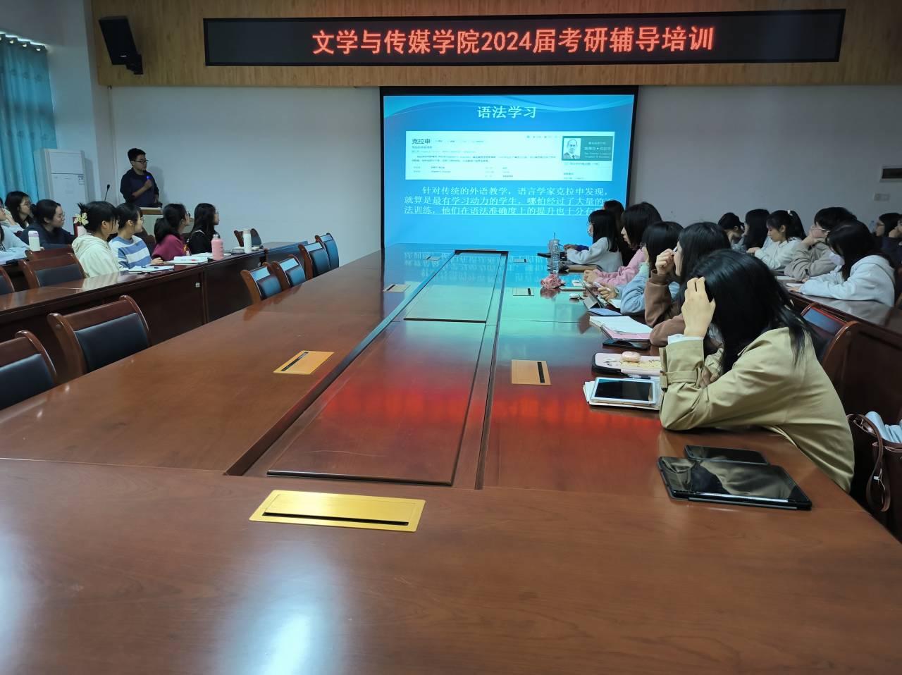 本站讯 4月25日,我院于我校东区至善楼309会议室开展2024届考研英语辅导。该辅导由我院教师刘维主讲,我院2024届考研学生参与。