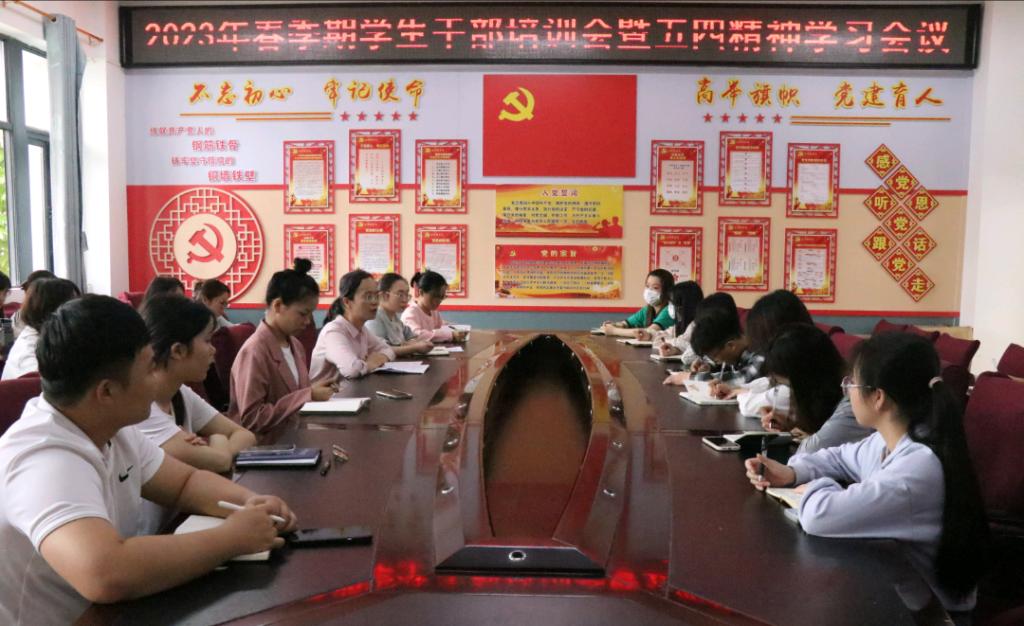 本站讯 为进一步增强新时代青年的爱国情怀,继承和弘扬五四精神,加强学生干部队伍建设,5月9日,我院于我校东校区至善楼206会议室举行2023年春季期学生干部培训会暨五四精神学习会议。本次会议由我院团委书记秦爽主持,我院党委副书记梁丹出席会议,辅导员韦艳、夏恩强、庞嵘嵘、覃梦瑶以及部分学生干部参加会议。