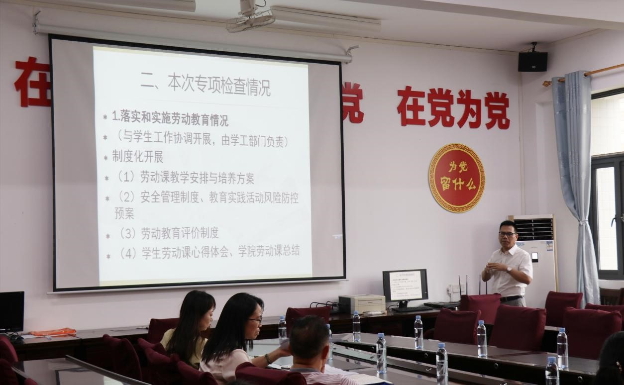 会上,郑立峰首先就学院本科教研计划执行、课程档案建设、教学教案完善、实验室开放、教学督导听课反馈等日常教学工作情况作简要阐述,对学院在教学督导过程中采取“推门听课”和“听、看、查、问、评”的方式所取得的教学监管效果及发挥的作用作了详细介绍。随后,郑立峰围绕落实和实施劳动教育、一流专业及一流课程建设、“三习”工作开展三大方面进一步对专项检查情况作详细汇报。
