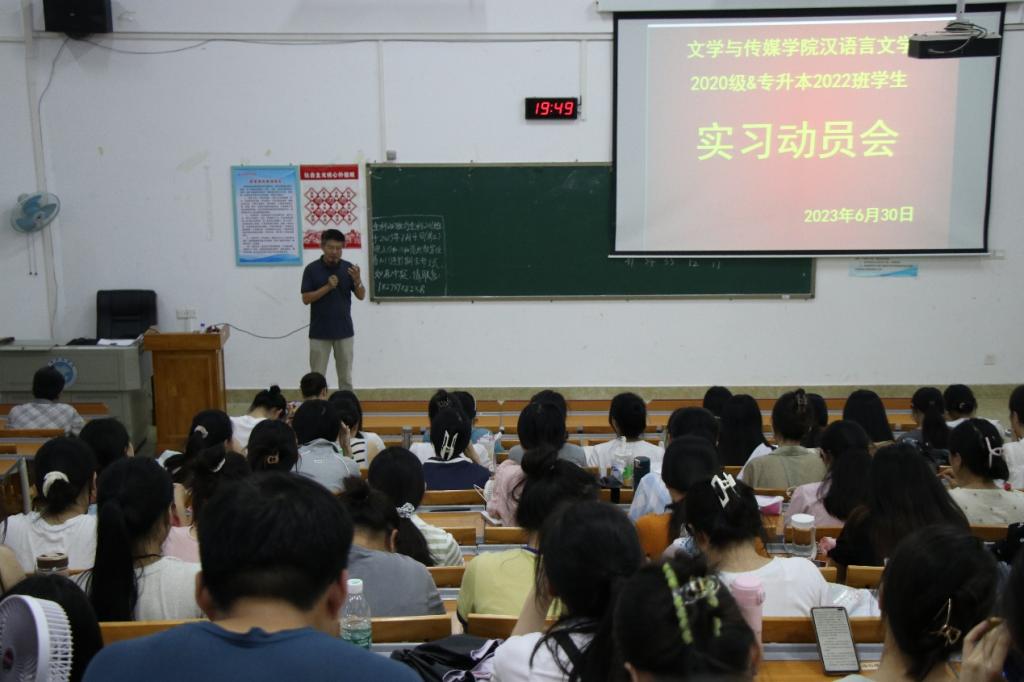 本站讯 为推动促进师范生学科理论与教育实践深度融合,保障学生实习工作的有序开展,6月30日晚,我院于我校东校区至善楼101教室召开汉语言文学2020级及专升本2022班实习动员培训会。我院院长肖国栋出席此次会议,本次会议由实习负责老师张伟超主持,相关班主任老师以及汉语言文学专业2020级、专升本2022班学生参加会议。