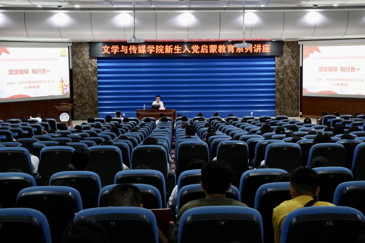 本站讯 为切实做好2023级新生入党启蒙教育工作,加强对党的认识,引导新生积极向党组织靠拢,9月6日上午,我院于我校东校区学术报告厅举行2023级新生入党启蒙教育系列讲座,本次讲座由学院党委书记邱冠主讲,学院党委副书记梁丹主持,各学生党支部书记及2023级全体新生参加。