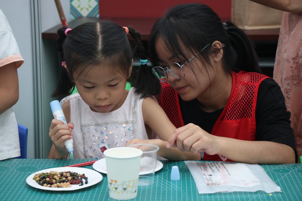 随后,志愿者罗悦维带领小读者们开展了下半场的手工拼贴活动。一支支铅笔和彩笔被发放到小读者们手中,他们在白纸或纸盘上画出跃动的线条,再用胶水将豆类填满图形。活动妙趣横生,亲子互动情谊满满,家长和孩子们在这里收获了共同的快乐。