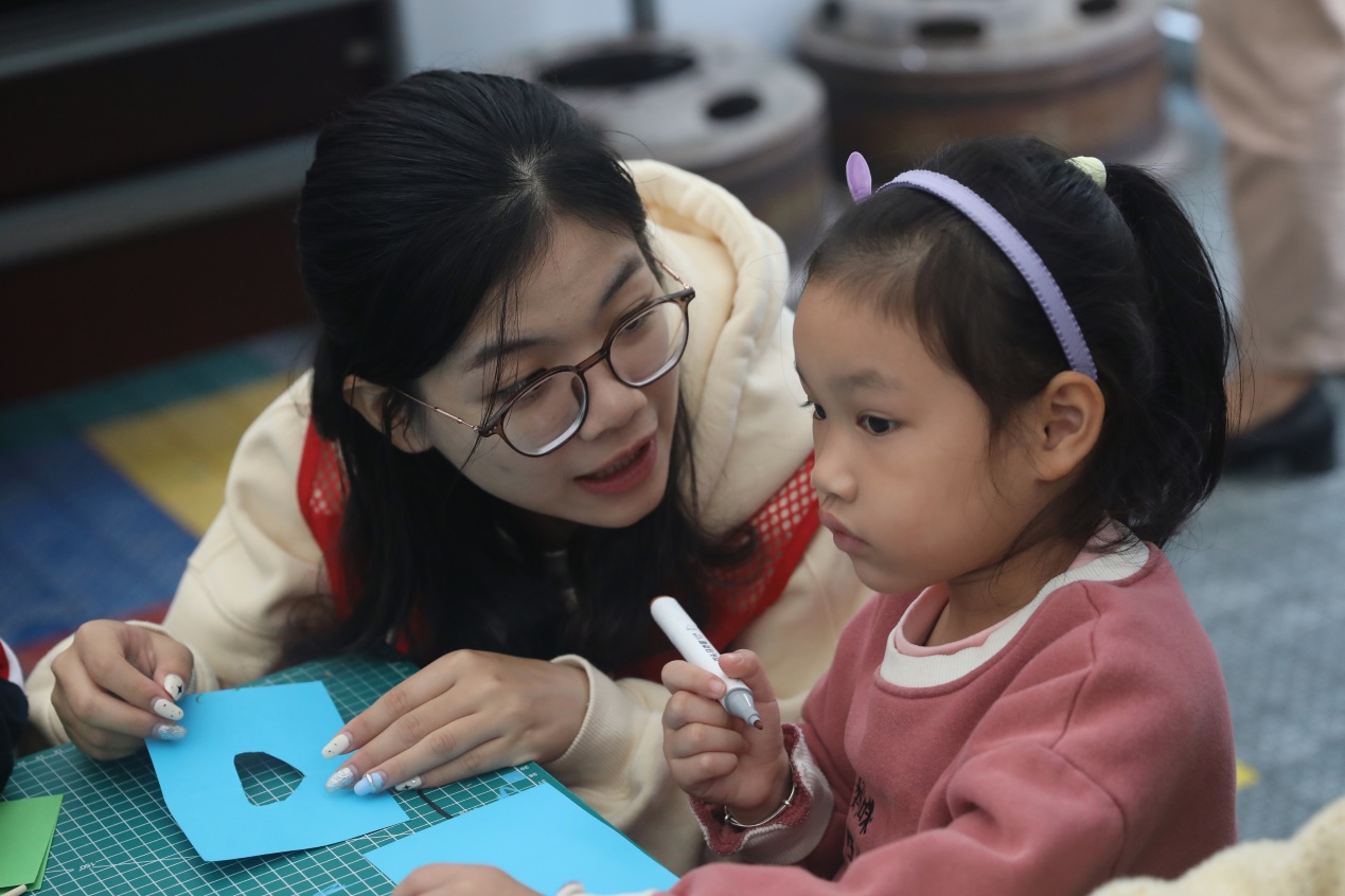 活动开始,志愿者沈晴向小读者们讲述《我和奶奶的夏天》绘本故事,从而讲解重阳节的相关知识,引导小读者们向长辈表达爱意,并学会尊敬、孝敬长辈。讲解过程中,沈晴以提问的方式与小读者们进行交流互动,小读者们热情活跃,踊跃举手回答问题。接着,志愿者带领小读者们前往手工区,将彩色卡纸和木棍分发至每位小读者,协助他们制作爱心小棒。志愿者们鼓励小读者充分发挥想象力,在卡纸上绘制爱心和自己心仪的图案,在志愿者和家长的帮助下进行裁剪、粘贴等步骤,共同完成了爱心小棒的制作。