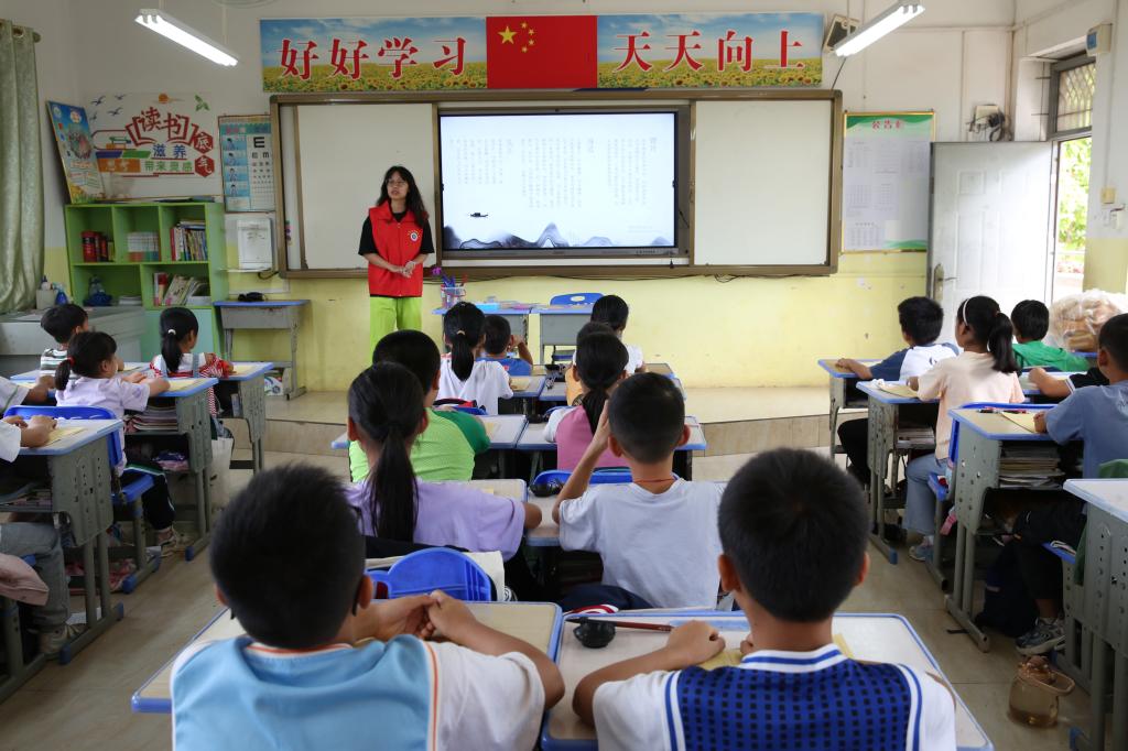 本次教学内容包括介绍以毛笔为主的书法工具、书法练习过程中的正确坐姿、控笔练习以及笔画练习,其中教学重点为学生动笔练习,让学生们在练习中切实感受书法。授课过程中,志愿者根据教学内容,设置有奖问答环节,充分调动学生们参与课堂的积极性,从而增强志愿者与学生之间的教学互动。动笔练习过程中,志愿者们来到学生身边进行坐姿和握笔姿势纠正,并手把手带领学生对“横”,“竖”等基本笔画进行练习。