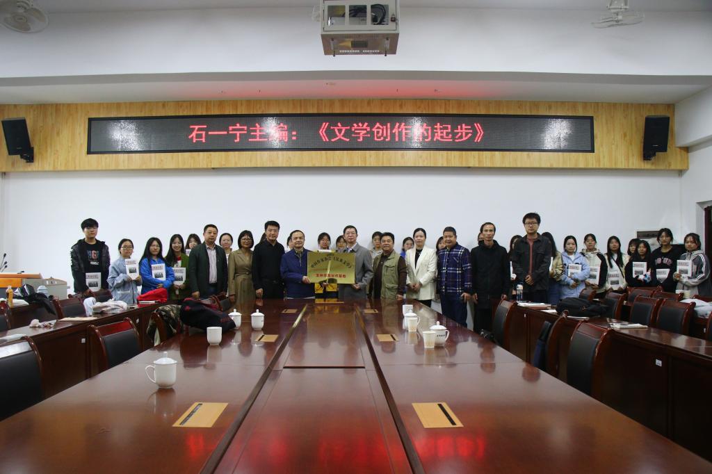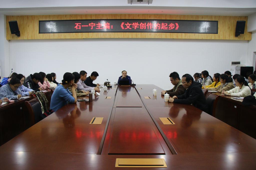肖国栋向在场人员介绍石一宁的个人经历,并对石一宁的到来表示感谢。石一宁围绕着“文学的创作”,以多位现代作家和自身从事编辑事业的经历为例展开叙述。他认为文学的创作一是要确立写作的动机;二是多读书,进行有选择性精读、细读;三是多看,多观察生活、多观察世界,做有深度的文章;四是多写、多练、多创作、多投稿,熟能生巧;五是多改,对文章进行多次精修与增改。