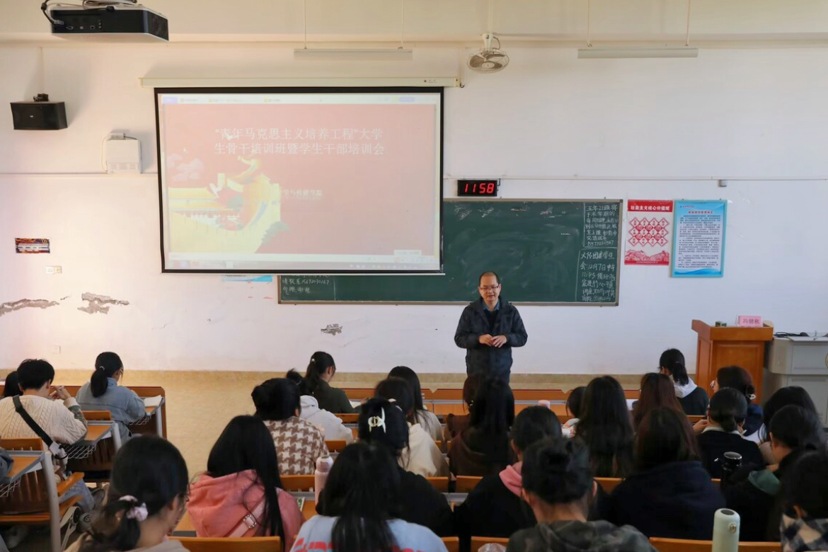 本站讯 为进一步加强我院大学生干部队伍建设,提升自身素质和能力,12月7日下午,我院在东校区至善楼308教室开展“青年马克思主义培养工程”大学生骨干培训班暨学生干部培训会,我院党委书记冯健秋主讲,团委书记秦爽主持,学院青马班成员以及全体学生干部参与。