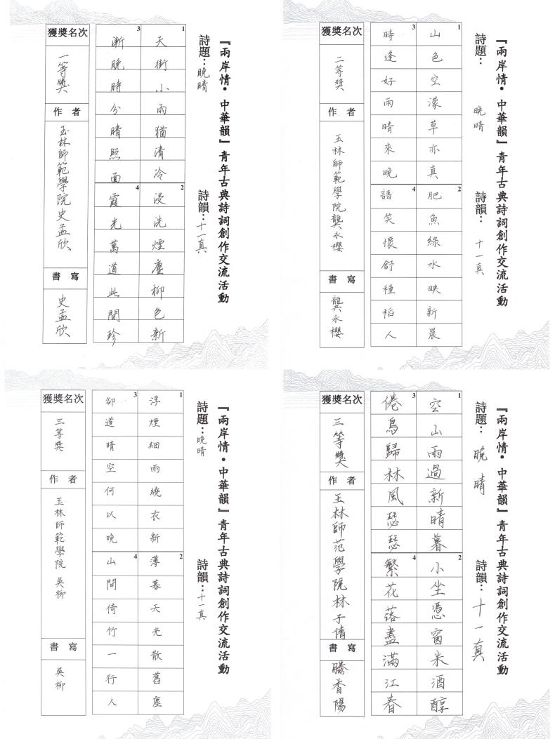 本站讯 近日,“两岸情•中华韵”桂台青年古典诗词创作活动之获奖作品硬笔书法展在东校区至善楼门厅进行展出。本次硬笔书法展由我院指导教师周于飞,依托教育部职业院校教育类专业教学指导委员会中文类研究课题一般项目《高质量发展下的师范院校中文类专业课程思政改革建设》开展实训教学,我院汉语言文学专业选修《三笔字与简笔画》课程的部分选课学生以“两岸情•中华韵”桂台青年古典诗词创作活动的获奖作品为书写内容,进行硬笔字实训活动。