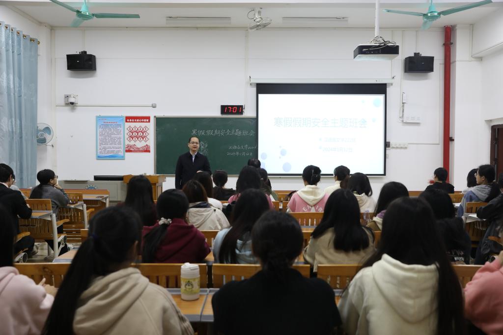 本站讯 1月12日下午,我院党委书记冯健秋到汉语言文学222班开展寒假假期安全教育主题班会,要求全体学生要牢固树立“安全第一”的意识,时刻紧绷安全之弦,珍爱生命,远离危险,确保度过一个健康、文明、安全而充实的寒假。