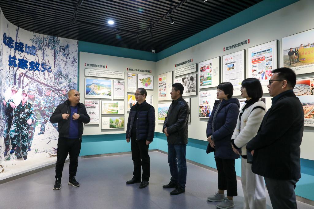 在广西日报社,考察组一行参观了广西日报社报史馆、通联采访部记者之家以及广西云指挥中心,听取了广西云发展成效与布局等介绍,了解新闻媒体行业发展和人才需求。冯健秋对广西日报社的热情接待表示感谢,希望双方能在相关领域开展进一步深入合作。肖国栋介绍了学院传媒专业发展以及部校共建方面取得的成效,希望广西日报社能为学院师生提供更多的实训平台和师资培训,拓宽师生的业务能力和行业视野。