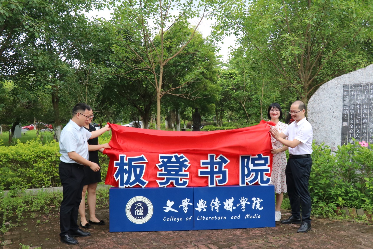 活动中,杨潇,范良辰,冯健秋,邓荫金四人一同为板凳书院揭牌。