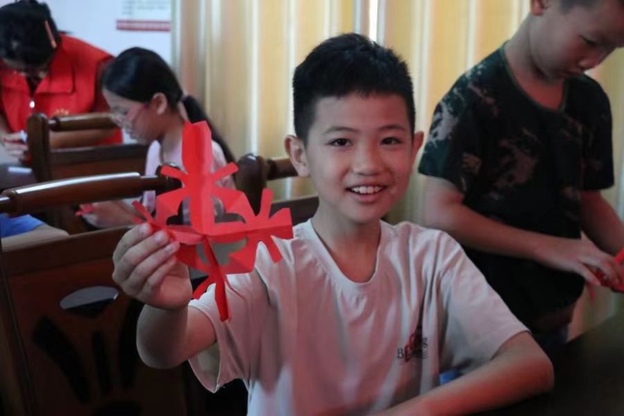 在国学课堂中,支教团成员融入丰富多彩的文化体验活动。书法课上,小朋友们沉浸在硬笔书法的世界,从一笔一划开始,用心感受汉字的形态之美,领悟书法的神韵之道。他们学习如何控制笔尖,展现出汉字的端庄与优雅。小朋友们从中不仅提高了书写技巧,更在墨香中感受到了中华文化的博大精深。手工课上,一张纸、一把剪刀,让小朋友遨游在探索民俗文化、开展手工剪纸体验的活动中,亲身参与到保护和传承非遗文化行动中。
