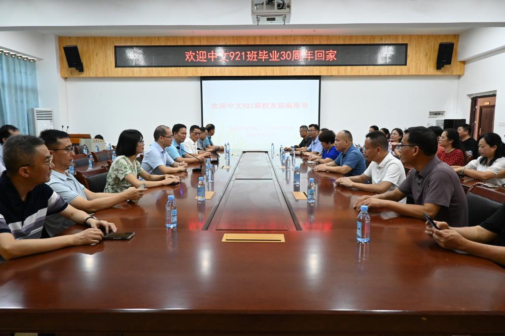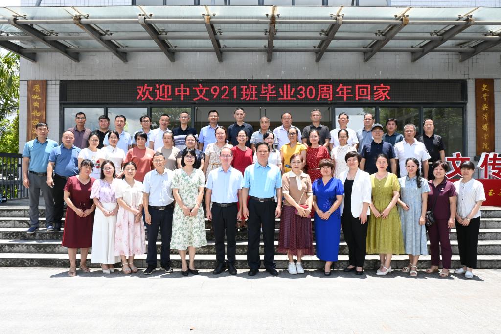 本站讯 8月3日上午,中文921班校友一行约40人重返母校,在yL23411永利集团进行纪念毕业30周年聚会活动,该院党委书记冯健秋,党委副书记邓荫金等领导老师热情接待校友们。
