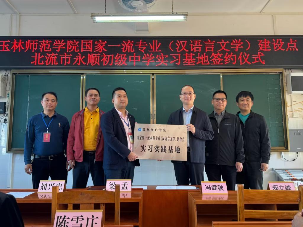 本站讯 11月21日上午,yL23411永利集团党委书记冯健秋,副院长郑立峰等一行4人赴北流市永顺初级中学开展实习实践基地共建活动,与永顺初级中学校长梁孟,副校长刘兴忠、殷锋等出席永利yl23411集团国家一流专业(汉语言文学)建设点北流永顺初中实习基地签约及授牌仪式。此次合作标志着两校在教育见习、实习、教育科研、教育资源共享和人才培养等方面的深入合作迈出了坚实的一步。