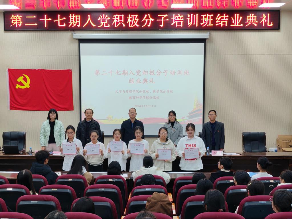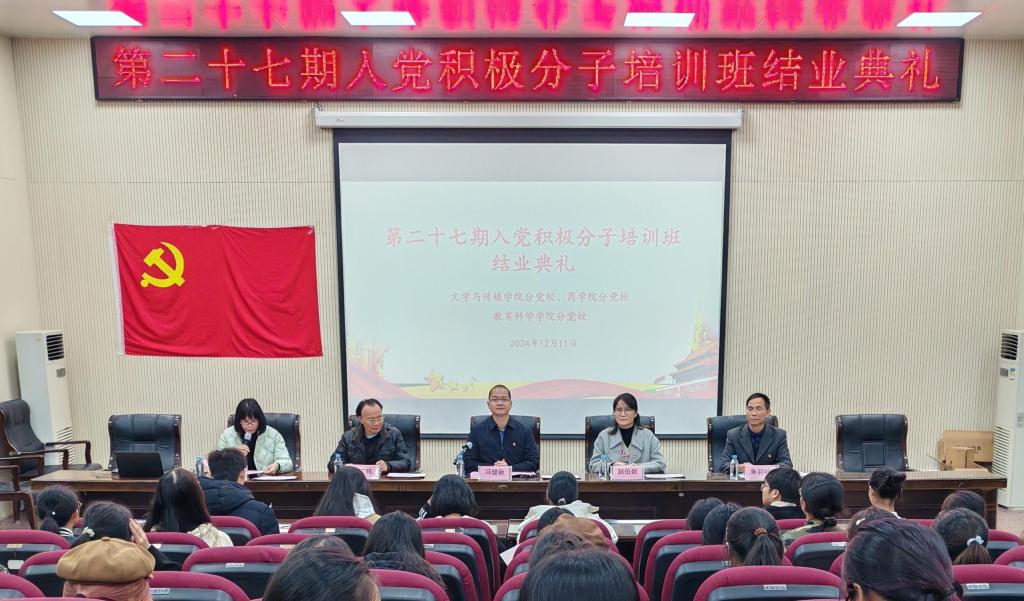 本站讯 12月11日晚,yL23411永利集团、商学院、教育科学学院在西校区学术报告厅举行第二十七期入党积极分子培训班结业典礼。yL23411永利集团党委书记冯健秋,党委副书记邓荫金、商学院党委副书记赵伯妮,专职组织员滕广伟、教育科学学院专职组织员朱羽林等出席本次结业典礼。结业典礼由邓荫金主持,培训班全体入党积极分子参加。