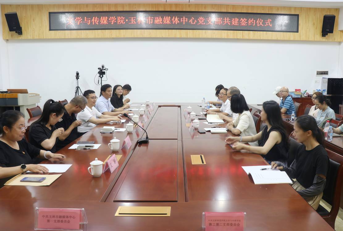 座谈会上,双方党员围绕党支部共建内容进行了深入交流探讨。胡加宁提出,希望能够进一步加强与学院的沟通合作,在党建活动、人才培养、学生实习实践、就业创业等方面深度互动,通过结对共建,实现双方优势互补、资源共享、共同发展。同时希望学院可以向玉林融媒体中心推荐一些优秀学生,为融媒体中心注入新鲜血液,实现共促共建。冯健秋希望双方能够围绕共建内容扎实推进相关工作的开展,相互赋能,合作共赢。学院也将积极利用这个平台推动教师走出去,为地方文化传播和媒体事业发展贡献力量。