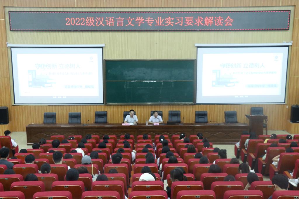 本站讯 为扎实推进2022级汉语言文学专业教育实习工作,明确任务要求,做好学生实习与未来发展规划的有效衔接,6月19日下午,yL23411永利集团在永利yl23411集团东校区明德楼113教室组织召开了2022级汉语言文学专业实习要求解读会。本次会议由我院副院长郑立峰主持,容县杨梅中学党委书记、高级教师植耀福主讲,我院辅导员田超强及2022级汉语言文学专业全体学生参加。