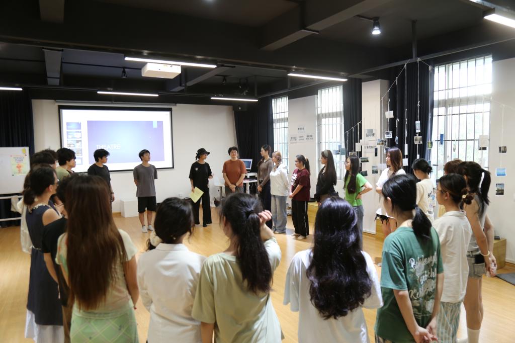 在剧场知识教学环节,王玮娜从剧场的演变、舞台的形式、舞台、剧场人员的分工以及剧本格式和内容等五个方面进行讲解,并以经典剧目《暗恋桃花源》为案例,指导学员分组开展10分钟片段排练。她强调“先读剧本再分台词”的方法,针对排练问题给予专业指导。排练结束后,学员们通过小组互评,进一步明确自身表演中的优缺点。