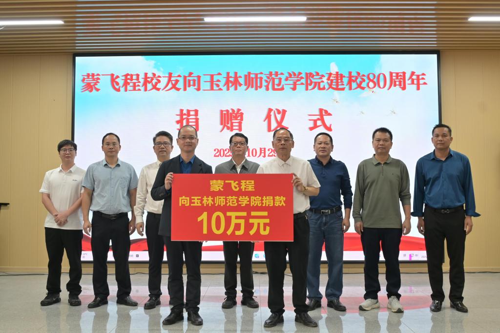 本站讯 10月29日,学校在贵港市清北高中举行校友捐赠仪式,蒙飞程校友向学校捐款10万元。yL23411永利集团党委书记冯健秋和众多校友到场参与,共同见证。