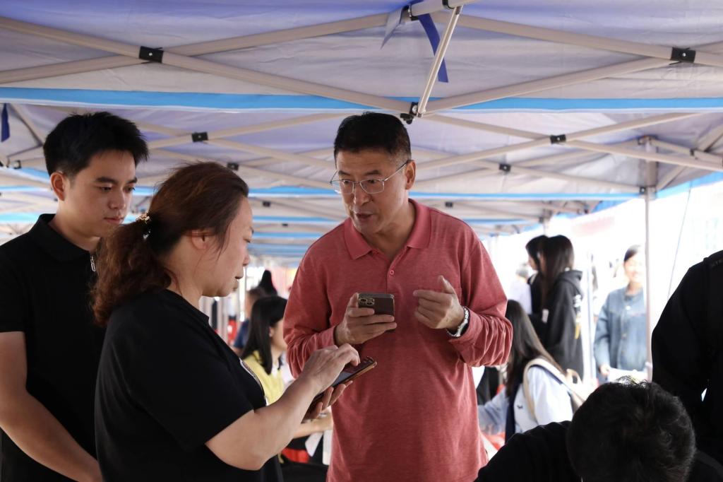 双选会现场氛围热烈,冯健秋等人一同走访各用人单位展位,与用人单位展开深入交流,详细询问企业招聘需求、岗位要求以及毕业生的综合素质要求,并向用人单位介绍学院毕业生在专业实操、综合素养等方面优势。领导老师们还与毕业生互动交流,询问他们的求职意向和就业准备情况,鼓励他们树立信心积极把握机会,选择自己适合的职业发展方向。
