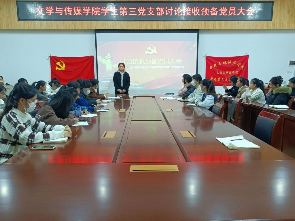 本站讯 12月15日晚上,我院学生第三党支部在东校区至善楼309会议室召开预备党员接收大会。会议由该支部书记韦艳主持,该支部全体在校党员及发展对象参加此次会议。