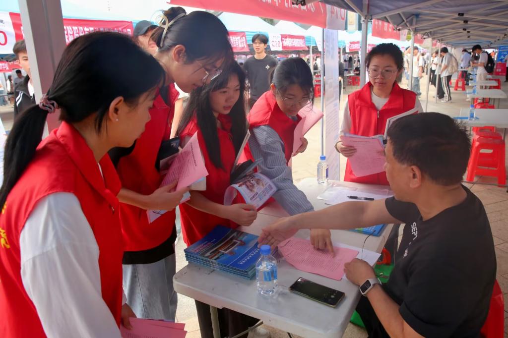 双选会当日,志愿者团队以专业高效的服务全程护航招聘活动。清晨8时,志愿者们便已就位,有序开展入场引导、签到登记、材料分发等工作。作为用人单位、毕业生和校方之间的沟通桥梁,志愿者们实时对接各方需求,动态跟踪招聘进展。此外,党员志愿者们还帮助毕业生结合个人能力与职业规划优化求职策略,实现精准投递。同时,志愿者们积极收集用人单位反馈,为后续就业服务工作提供数据支持。