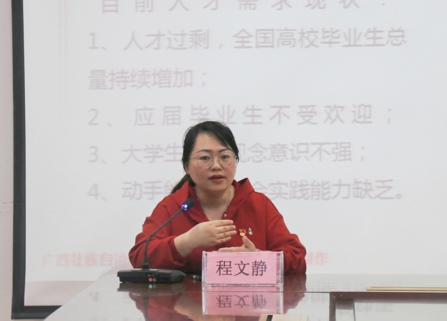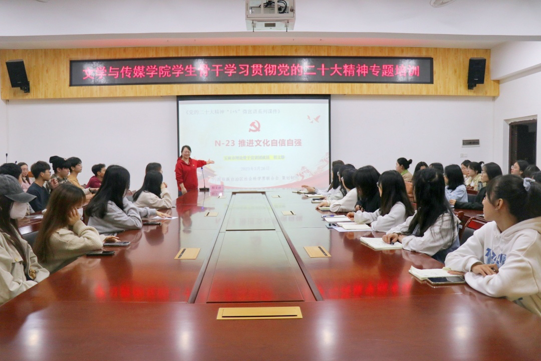 本站讯 为学习贯彻党的二十大精神,增强当代青年的文化自信,3月25日下午,我院于我校东校区至善楼309会议室召开学生骨干学习贯彻党的二十大精神专题培训宣讲会,本次会议由玉林市理论骨干宣讲团成员程文静主讲,我院团委书记秦爽,办公室主任陈冬业,辅导员韦艳,团委会、学生会部分成员参加会议。