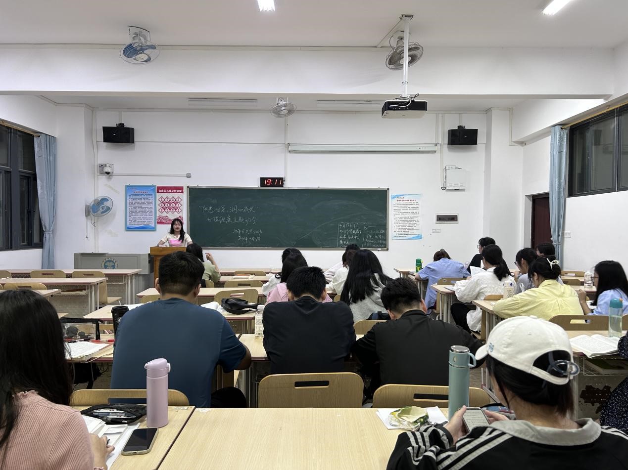 本站讯 为加强学生对心理卫生知识的了解,引导学生以自信、阳光的心态迎接未来,4月17日晚上,我院汉语言文学201班于我校东校区至善楼501教室召开以“阳光心灵,润心成长”为主题的心理健康主题班会。本次班会由该班心理委员韦扬泉主持,该班全体学生参会。