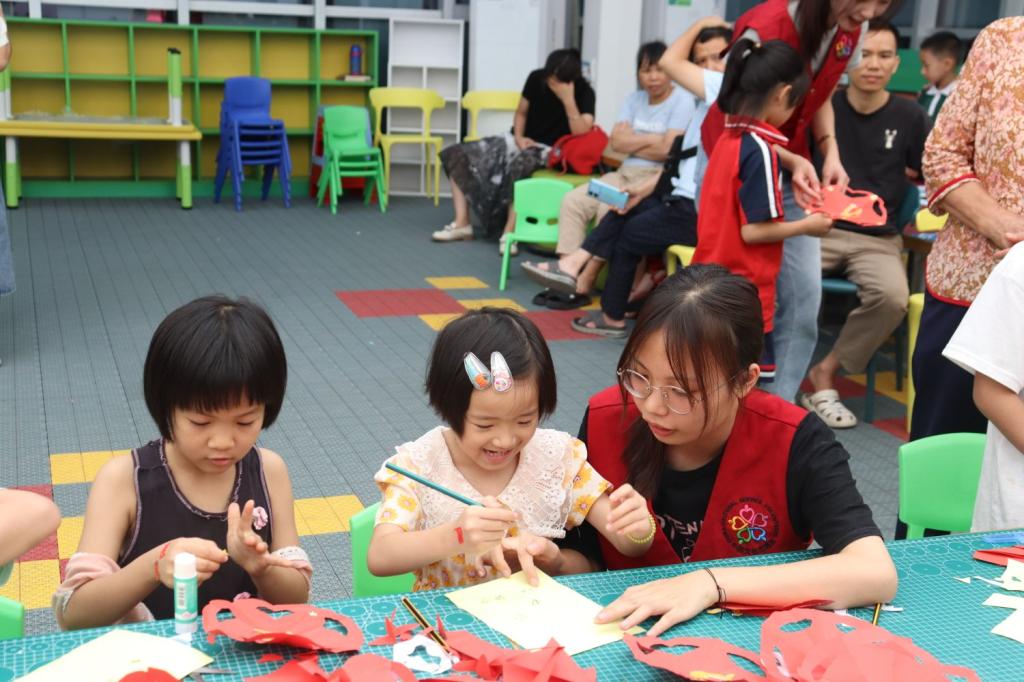 在剪纸手工体验活动中,志愿者何英蕾分步骤向小读者们讲解如何制作七一活动剪纸。小读者们踊跃参与,靠着丰富的想象力,在家长和志愿者们的协助下制作出充满童趣的红色剪纸作品。