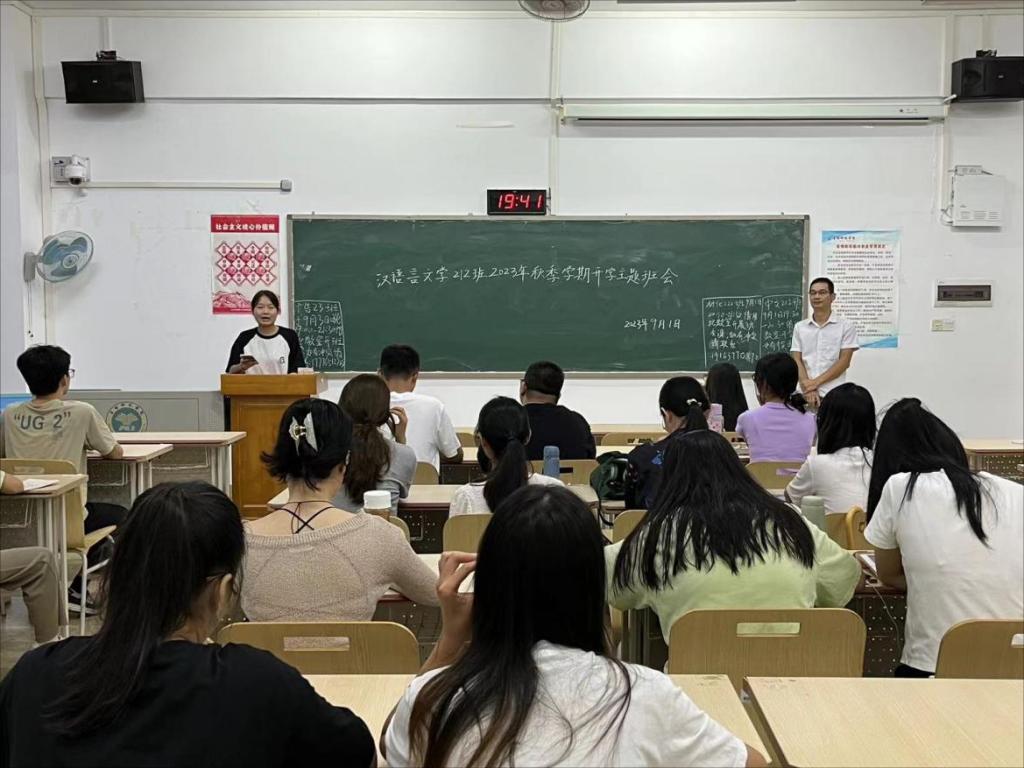 本站讯 为落实学院新生迎新相关工作,增强学生们学习热情,激发班级活力,9月1日晚,我院汉语言文学212班于我校东校区至善楼301教室开展2023年秋季期开学主题班会。此次会议由该班团支书周慧潇主持,班主任张学军及全体学生参加。