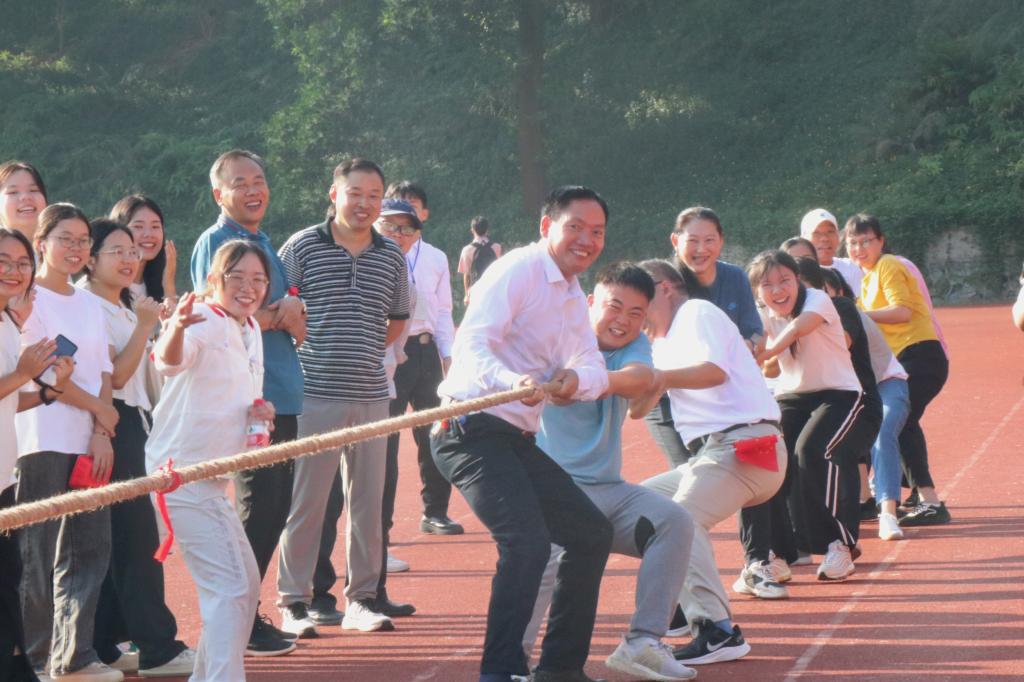 比赛开始前,双方纷纷发力,紧握麻绳,身体微微下沉。随着哨声一响,双方都卯足了劲往后拉,场外的啦啦队都在奋力呼喊为两支队伍加油助威。第一局开始,教职工组迅速地把绳子向自己的阵营拉近。但学生组并不气馁,在交换场地后进行了第二次比拼。学生组开始发力,双方僵持不下,战况胶着,场上气氛热烈。当红绳向学生组靠近时,学生组把握机会,赢得第二局。双方在交换场地后开始了第三次比拼。教职工组迅速改变队形,调整策略,在胜负难分的时刻咬紧牙关,一鼓作气,赢得了第三局的胜利。