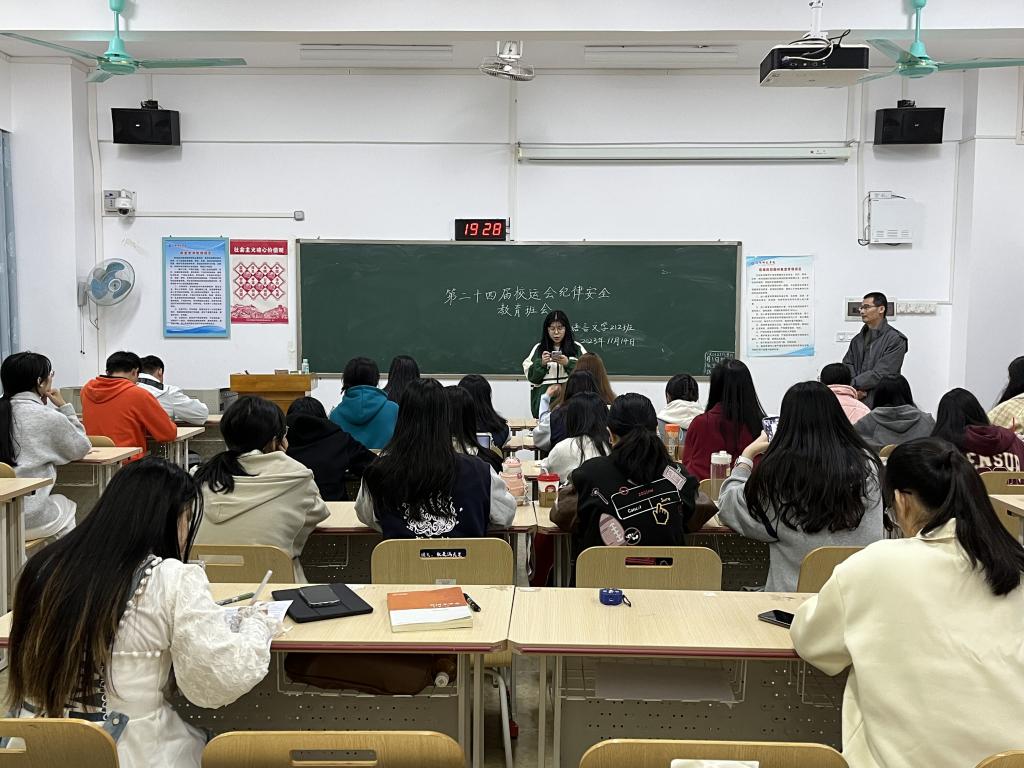 本站讯 为确保校运动会的顺利进行,提高学生的安全意识,11月14日晚,我院汉语言文学212班在东校区至善楼501教室召开第二十四届校运会纪律安全教育班会。此次会议由该班班长蓝思瑶主持,班主任张学军和该班全体学生参加。