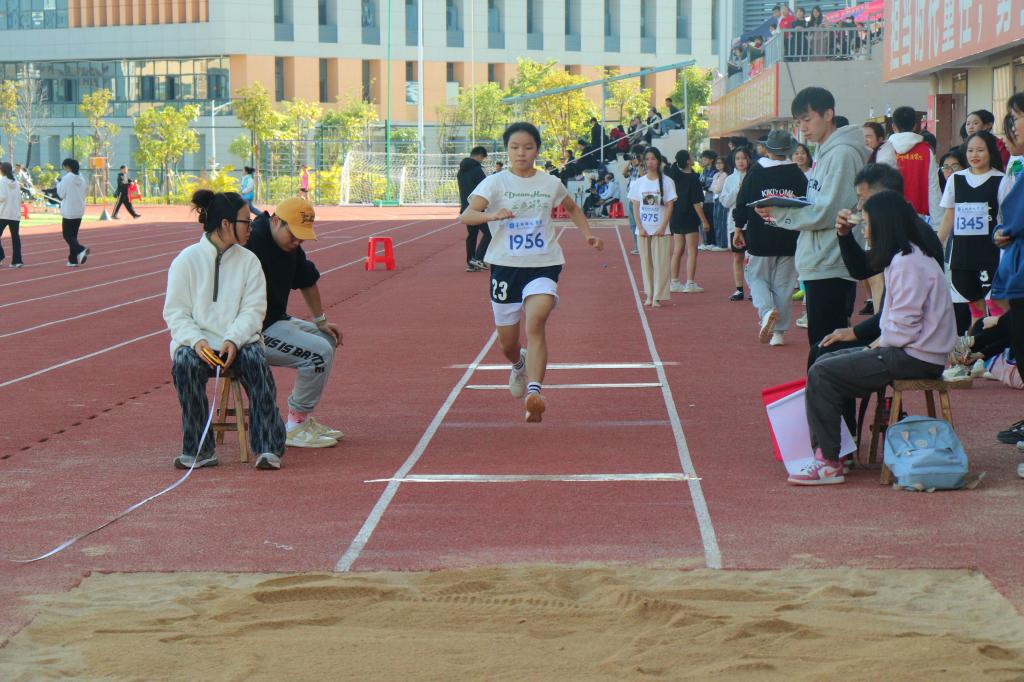 比赛开始前,我院选手提前进场并进行试跳、拉伸等热身活动,为比赛积极做准备。随着裁判一声令下,比赛正式开始,运动员们按顺序依次进行跳远。运动员们奋力助跑,借力腾空。赛场上激烈的赛况与运动员们优秀的表现使场外的观众热情高涨,在场观众喊着催人奋进的口号,为运动员们加油呐喊助威。在第一次起跳中,黄秋燕不慎失利,后续她灵活调整自身状态,在第二次及第三次跳远获得成绩,韦媛珍在第一次及第二次纷纷获得良好成绩。