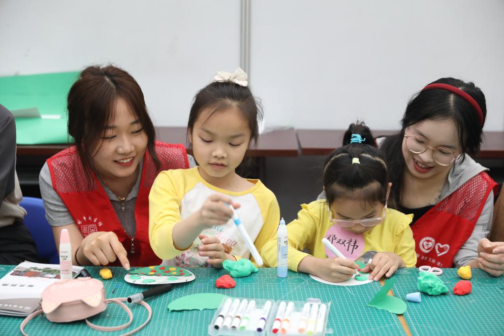 在手工制作环节,小朋友们在志愿者和家长的协助下开始制作粘土主题画,他们用自己的巧手,把一块块粘土揉搓成一颗颗“小青团”,再为它们画上四肢与五官。