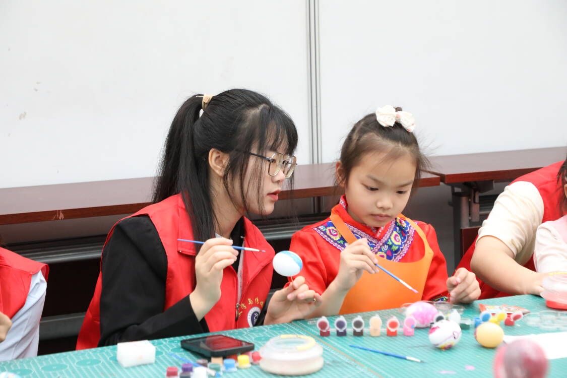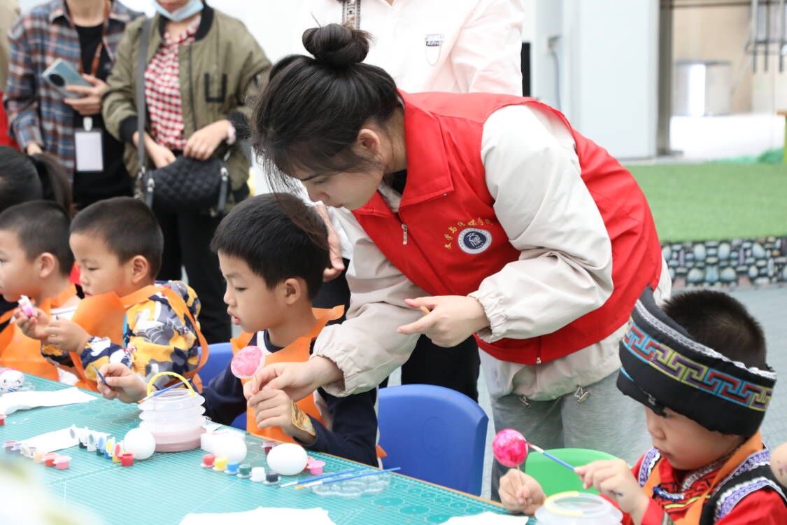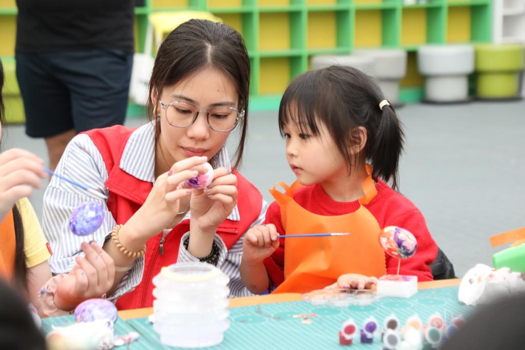 手工制作环节,小朋友们兴高采烈地参与制作彩蛋,在志愿者和家长的协助下,利用塑料蛋模型、颜料、画笔制作彩蛋。在小朋友们天马行空的想象力之下,一个个五彩缤纷的彩蛋制作成功,彩蛋寓意求得好运气与身体健康。