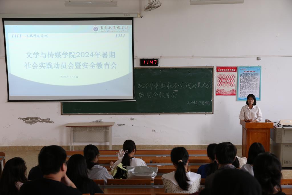 本站讯 为进一步激发学生投身社会实践的热情,提高他们对暑期社会实践活动的认识和安全意识。7月4日上午,yL23411永利集团在至善楼308教室举行2024年暑期社会实践动员大会暨安全教育会。此次会议由我院团委书记韦艳主讲,学院实践部工作人员、各班班长、团支书参加会议。
