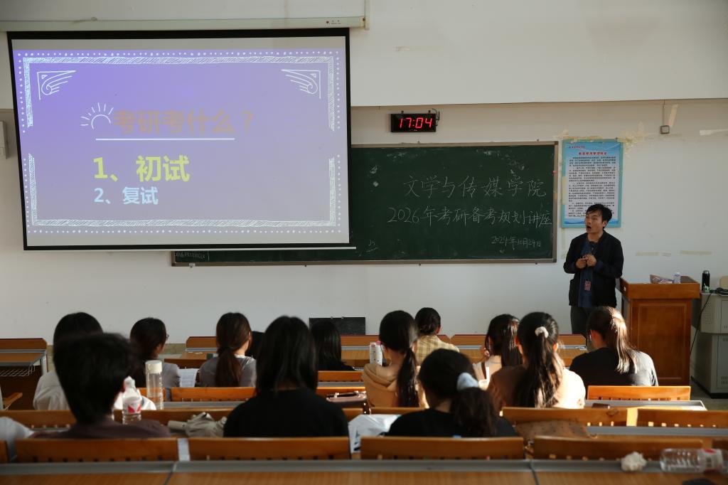 本站讯 10月24日下午,我院在我校东校区至善楼408教室举行2026年考研备考规划讲座,该会由研途教育考研金牌全程规划师曾金主讲,我院22级意愿考研学子参加本次讲座。