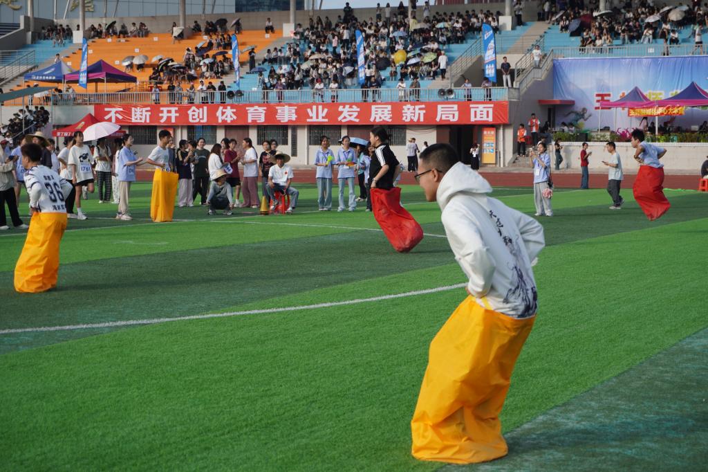 随着裁判员一声哨响,比赛正式拉开序幕。各位选手依次将双腿套入入袋中,以袋鼠般的姿态快速前进,他们的动作既滑稽又充满力量。