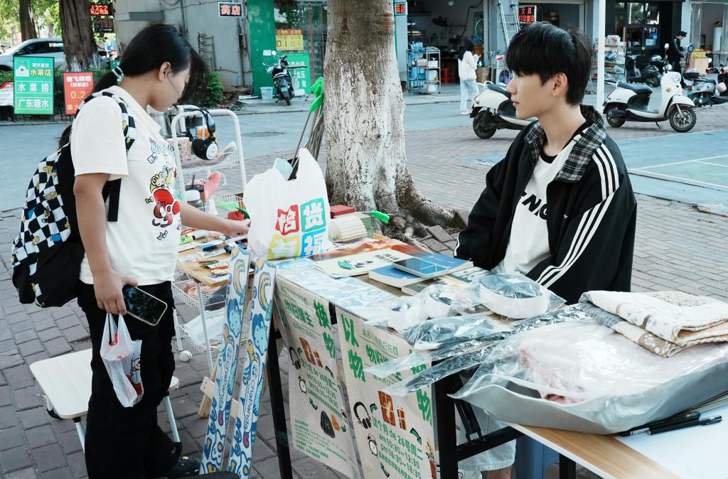 下午,黄露带领广告学2022班、广告专升本2024班学生在挂榜食府旁增设宝藏淘淘屋闲置物交易活动。