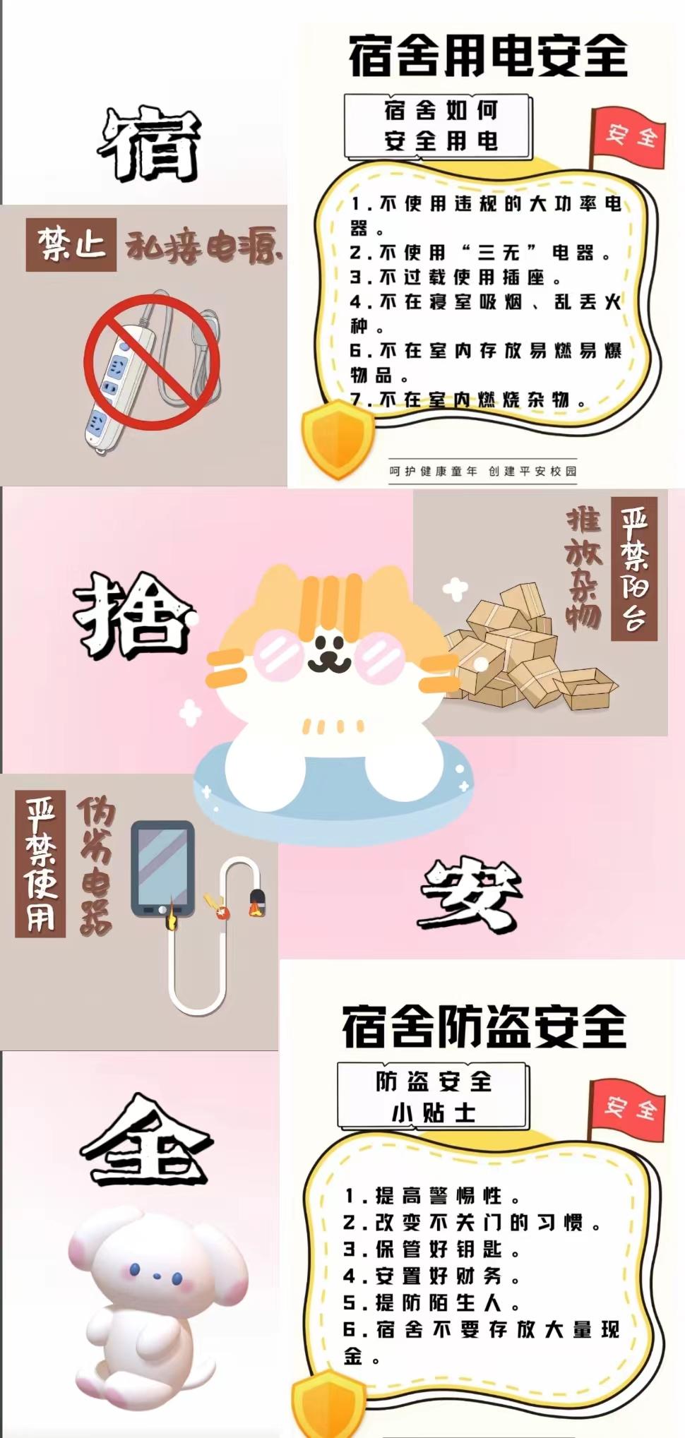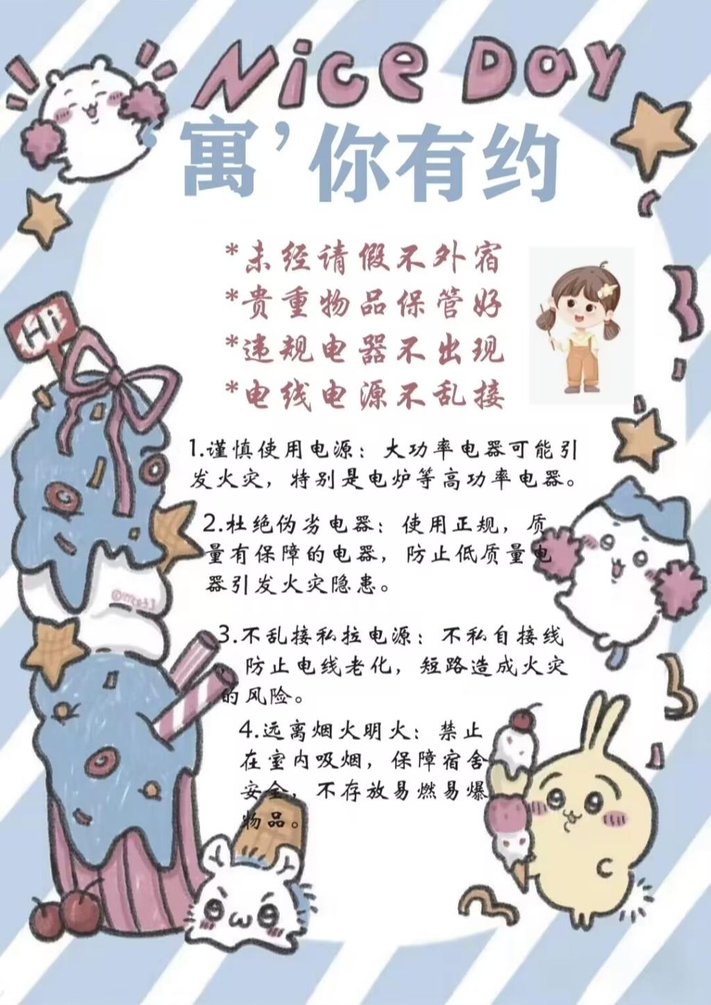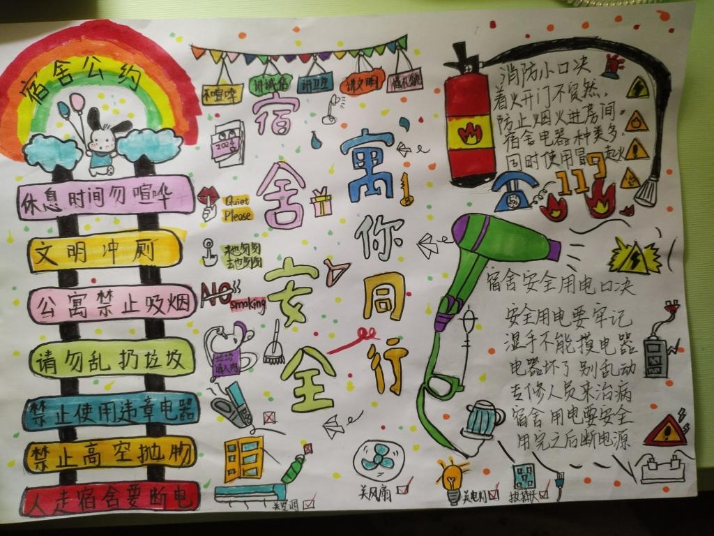 比赛以宿舍为单位,主题紧扣宿舍安全,同学们发挥各自特长,通过手绘、电脑设计的方式,表达自己对安全知识的理解。活动过程中,由各班纪检委报送材料至学生权益维护部邮箱。在众多作品中,创作者或以绚丽色彩勾勒出卡通形象,突出提醒防火防电要点;或以励志话语搭配图案,充分表达安全守纪的主题。不同作品构思巧妙,充分表现了宿舍成员团结协作的创作精神。评委从创意构思、视觉呈现、主题契合度多维度评审。从中选出了若干个宿舍的优秀作品。