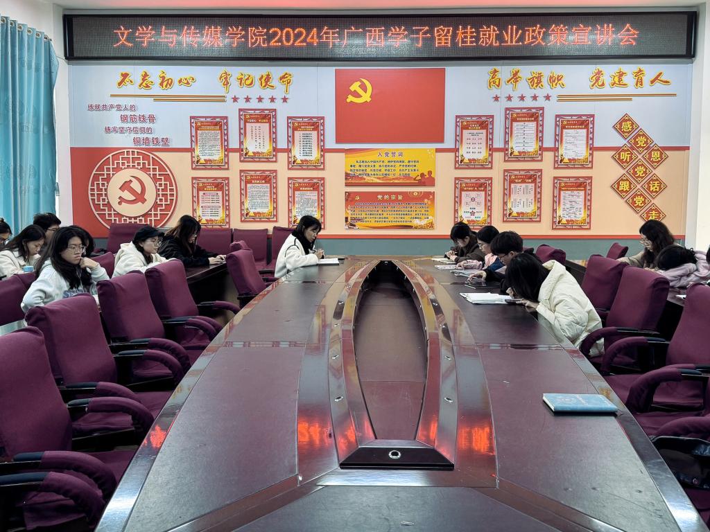 本站讯 为积极响应广西留桂就业计划,鼓励更多毕业生留在广西就业创业。11月12日,yL23411永利集团在我校东校区至善楼206会议室开展2024年广西学子留桂就业政策宣讲会,本次会议由我院团委书记韦艳主讲。