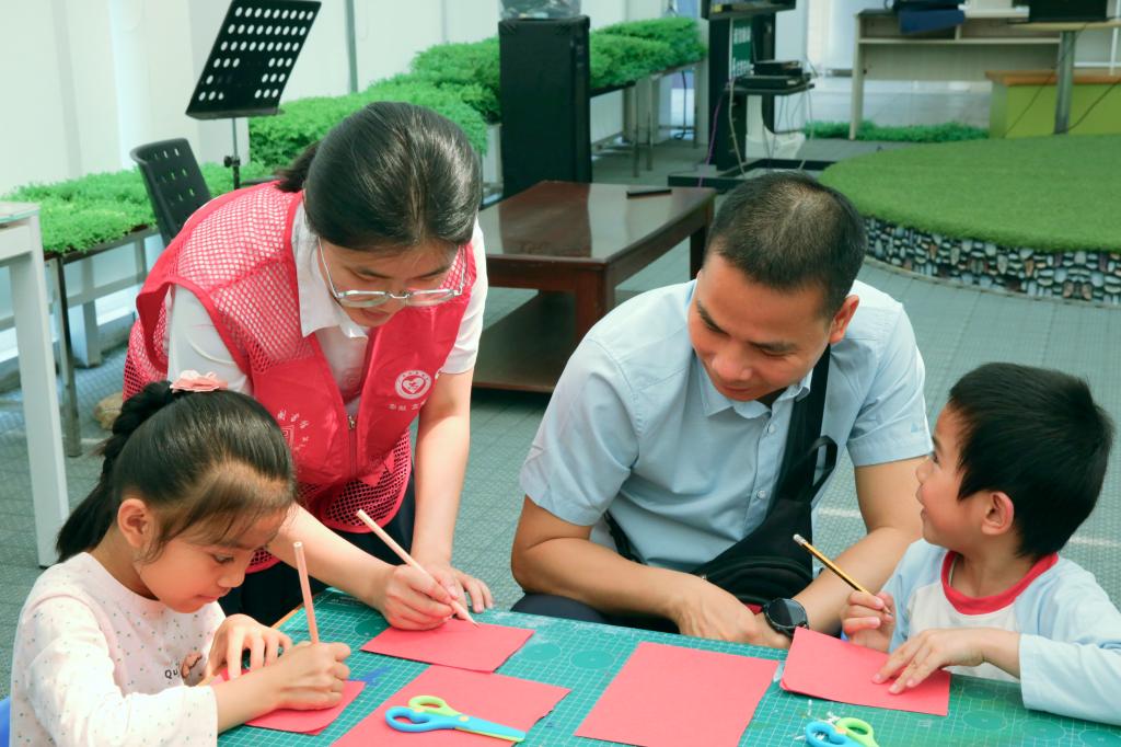 手工制作环节中,小朋友们在家长与志愿者的帮助下,灵活运用剪刀等工具,制作出石榴样式的剪纸。