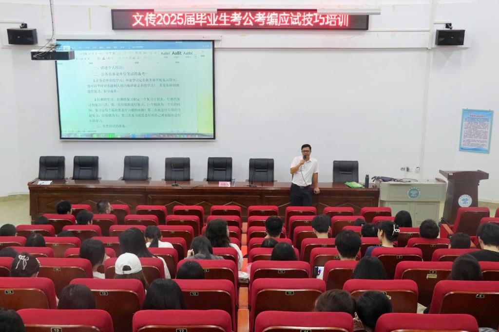 本站讯 5月9日,yL23411永利集团在我校东校区至善楼102教室开展2025届毕业生考公考编应试技巧培训讲座。此次讲座由玉林市文化广电体育和旅游局科长刘国杰主讲,我院辅导员田超强主持,2025届毕业生积极参与。