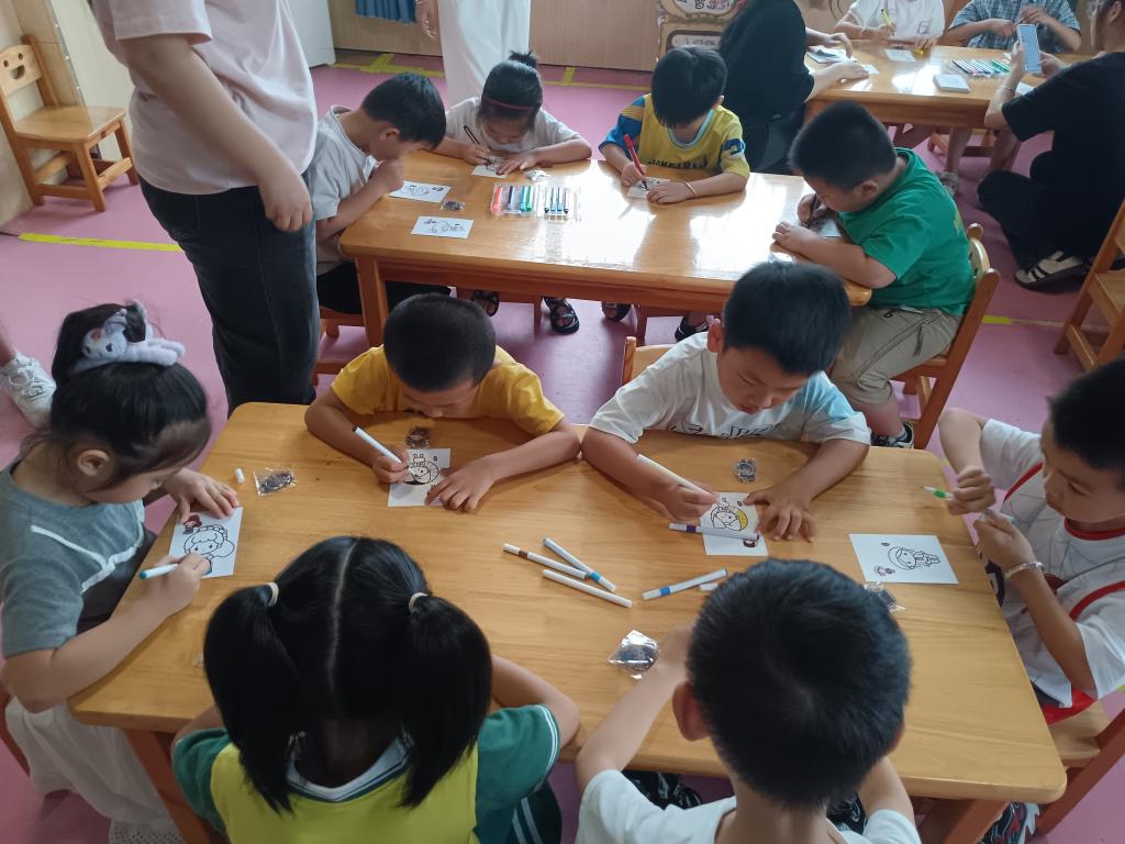 在填色卡环节,志愿者发放民族填色卡和绘画工具并介绍填色卡上仡佬族元素的含义,接着小朋友们自由填色,发挥想象力搭配色彩。志愿者鼓励小朋友大胆创作,并给予色彩搭配方面的建议。