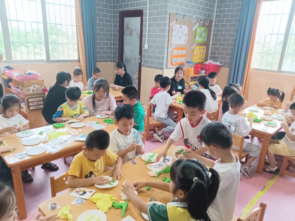 竹子手工坊里,志愿者介绍竹子在仡佬族文化中的重要地位。随后,志愿者为小朋友们分发手工材料,示范如何用黏土制作竹子。接着小朋友们亲自动手制作,同时志愿者巡回指导,帮助小朋友们完成手工制作。