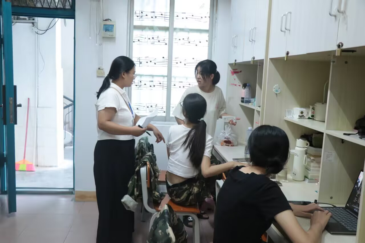 评比过程中,秦芳莹严格对照内务标准,对新生各宿舍卫生、物品摆放等情况进行细致检查,在现场依据标准完成打分评级。检查现场可见,新生宿舍普遍做到床上用品整齐、洗漱用品统一摆放、衣物收纳整齐有序,展现出新生对内务整理的重视与用心。