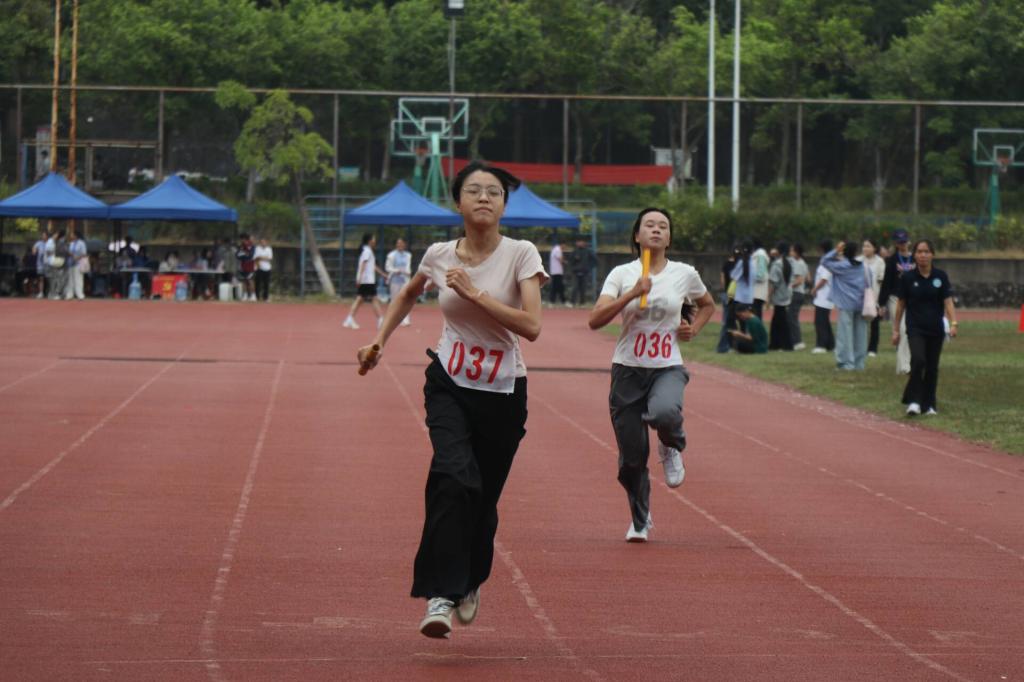 比赛现场气氛热烈,运动员们在检录处积极热身,为接力赛做好充分准备。随着发令枪响,比赛正式开始。选手们手持接力棒奋力向前冲,4道第一棒选手起跑迅速,在第一棒就与其他跑道上的选手拉开了距离,处于领先位置,其他选手奋力追赶,比赛处于白热化阶段。场外的加油声此起彼伏,拉拉队为运动员们加油助威。在全场瞩目的冲刺阶段,汉语言243班凭借最后关头的爆发力,以仅0.8秒的微弱优势,力压后一组的广告252班,成功斩获冠军,最终以1分07秒的成绩,赢得现场阵阵欢呼。